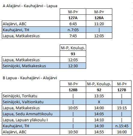 Reitti: Alajärven ABC (klo 6:45) – Alajärventie – Kurejoentie – Siihtalantie – Valtatie 16 – Honkiniementie (n. klo 7:05) – Järvenpääntie – Kauhajärventie – Valtatie 16 – Simpsiöntie – Lassilantie – Asemakatu – Lapuan Matkakeskus (klo 7:45)