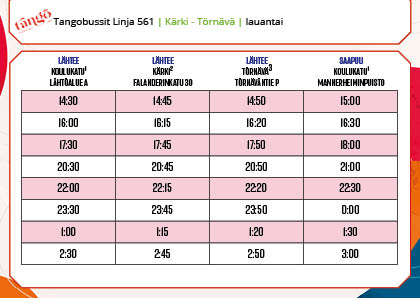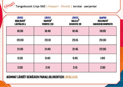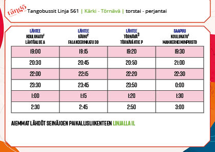 Seinäjoella tutut Tangobussit ajavat ahkerasti Seinäjoen asuinalueilta keskustaan torstaista lauantaihin 9.-11.7.2026. Bussit kulkevat yömyöhään jokaisena päivänä Kivistöstä, Kasperista, Kärjestä, Hyllykalliolta ja Karhuvuoresta!